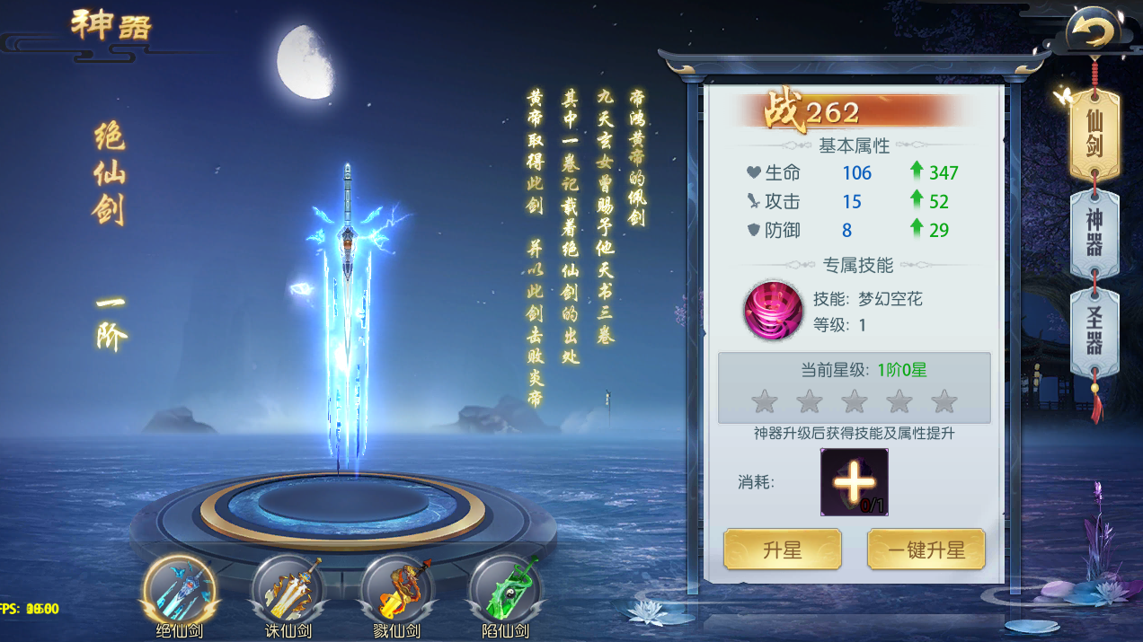 仙剑一共4种,分别是绝仙剑、诛仙剑、戮仙剑、陷仙剑,每一种仙剑对应一个主动技能,升级仙剑可以提升属性和技能,下面再简单介绍仙剑系统的进阶升星