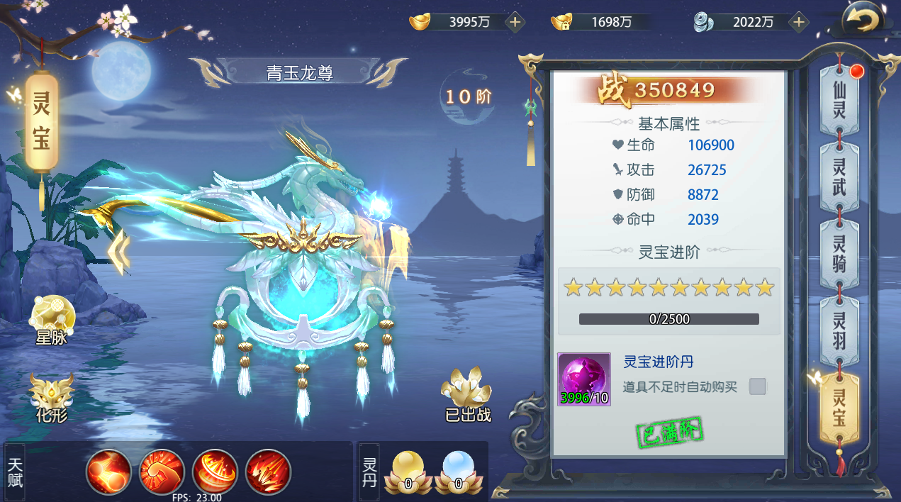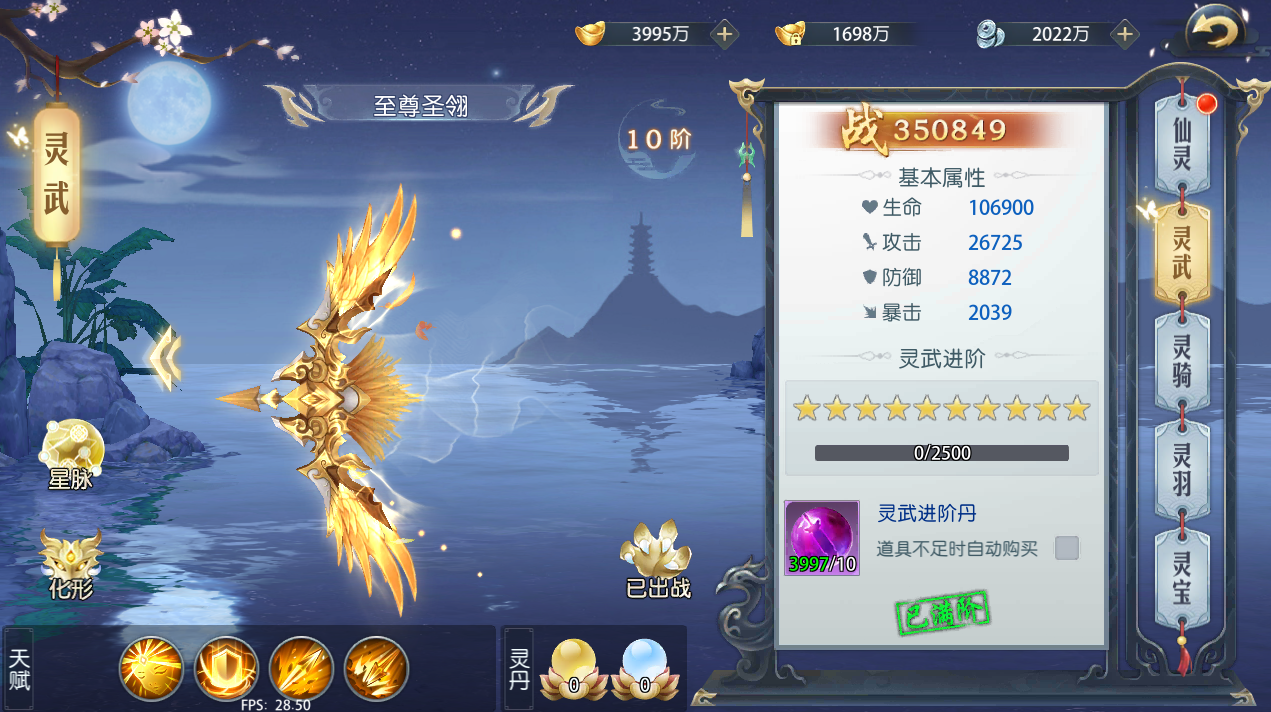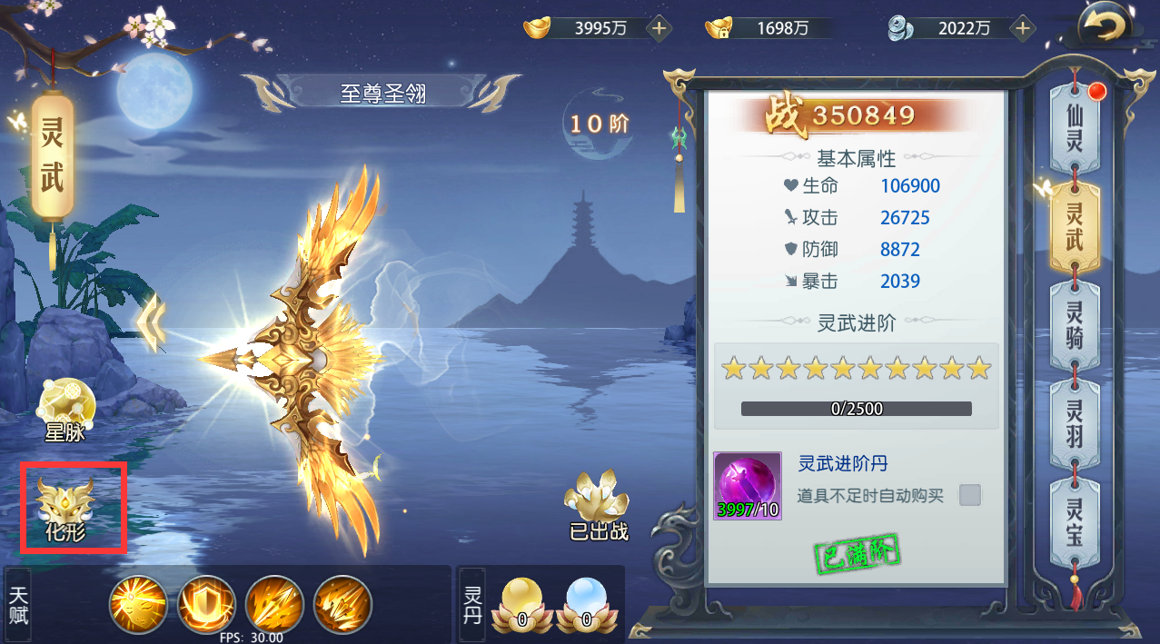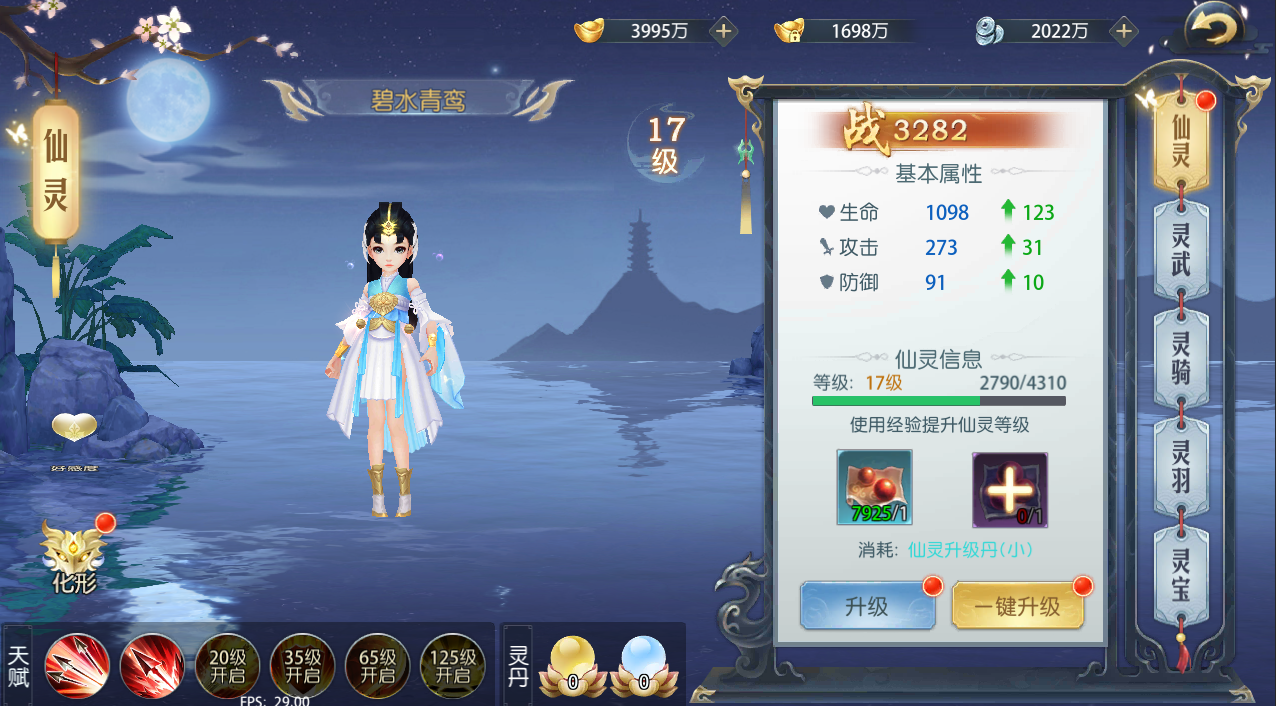 2、 仙灵、灵武等可以使用仙灵升级丹、灵武进阶丹等进行升级,只要经验值或祝福值满,就可以升级或升星