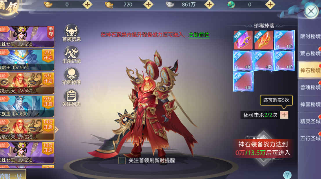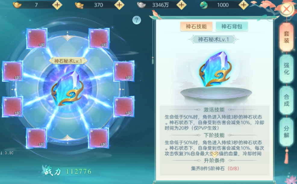 【玩法说明】玩家可通过收集神石装备激活神石系统。收集满8件后可以获得神石秘术技能:在生命低于50%的情况下获得百分比伤害减免、百分比攻击加成和普攻回血BUFF,大幅提升角色的PVP和PVE能力。神石装备可以合成后进阶,提高神石的技能的等级。