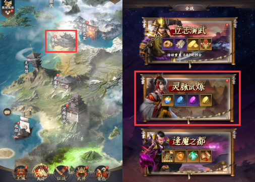 玩家的主角等级达到80级,即可选择主面板“天下”页栏,点击“合战”处,进入后选择“灵脉试炼”玩法。