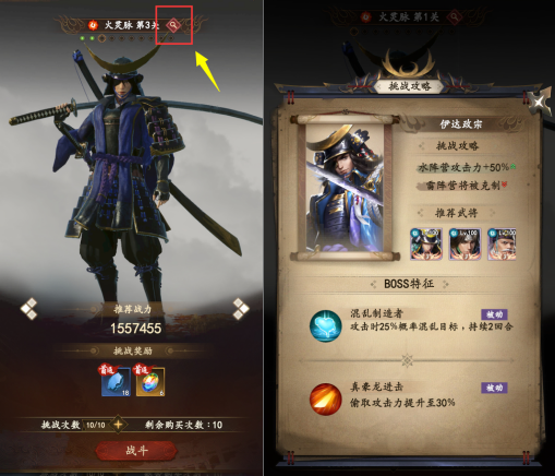 再来看看通关攻略。每个阵营都有不同的BOSS,BOSS会携带更加强力的被动战斗技能,拥有比普通武将更强的战力。点击关卡旁边放大镜图标位置,即可查看该BOSS特性和对战的阵营和武将建议。如火阵营主将为伊达政宗,其特征是“混乱制造者”和“真豪龙进击”,“混乱制造者”为攻击时有25%的概率混乱目标,持续2回合;“真豪龙进击”则为偷取攻击力提升至30%。针对这种情况,系统推荐用水阵营的武将浅井长政、吉川元春、毛利元就进行挑战。用克制阵营的武将,能提高50%的攻击力。