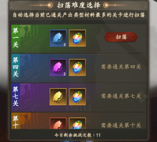 玩家每天有10次免费挑战次数。值得一提的是,玩家可以消耗挑战次数扫荡已通关的最高关卡,获得略少于首次通关数量的蕴灵石和灵物进阶石奖励,这样可以让暂未能通关后面关卡的玩家收益最大化。