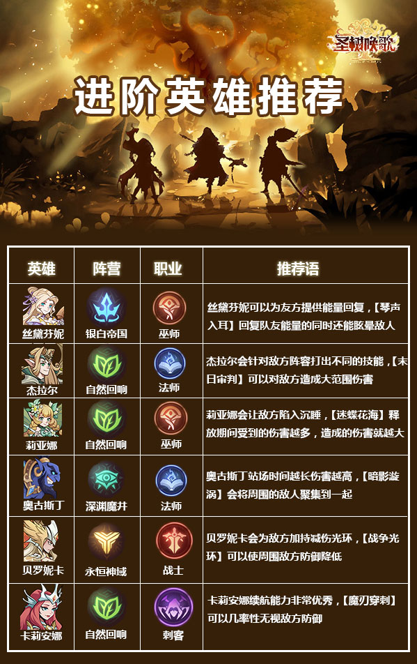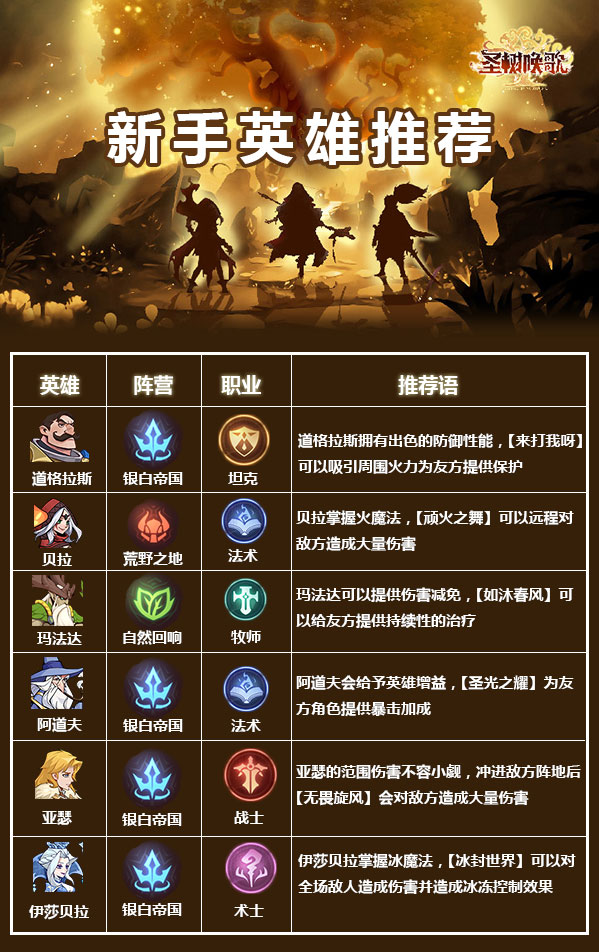 以上就是今天莉亚为大家带来的新手英雄选择推荐,勇士大大们可以根据推荐结合队伍阵营和职业的搭配,组成自己想要的队伍~除此之外,相信大大们在进入游戏后也会有更多更好的选择方案和策略!