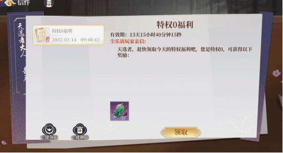说明:邮件可实现信息交流、领取系统奖励、获取系统咨询等功能。每封邮件包含:邮件标题,发件人,收件时间,剩余保存天数,正文内容,附件显示