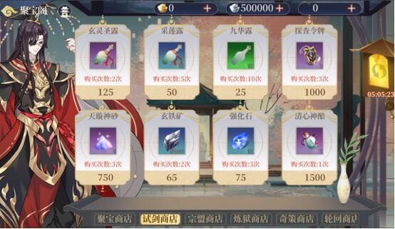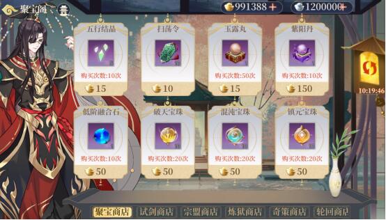 作用:游戏中所有商店的整合场所,包括聚宝商店、试剑商店、宗盟商店、炼狱商店、奇策商店、轮回商店、问剑商店、兑换商店、宝物阁