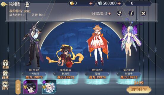 说明:通过与其他玩家战斗,争夺试剑楼排名,名称越高奖励越丰富,每次会根据自己当前的排名随机刷新四名对手,战胜对手后自己的排名会与对手排名互换,自己也可以设置一个防守阵容用来应对其他玩家的挑战。