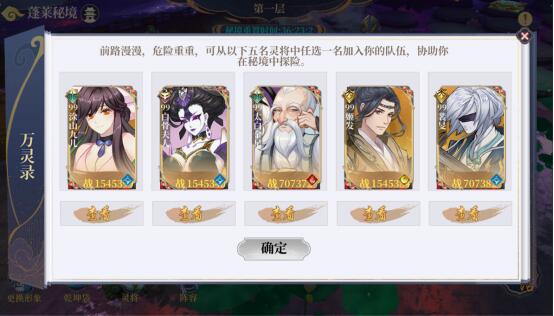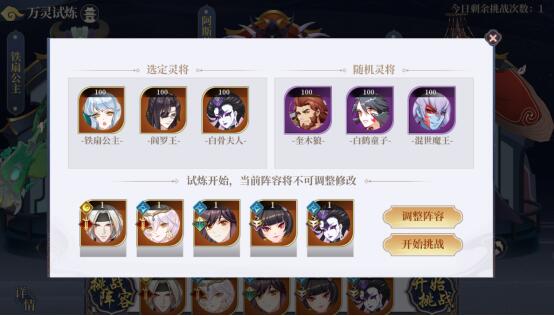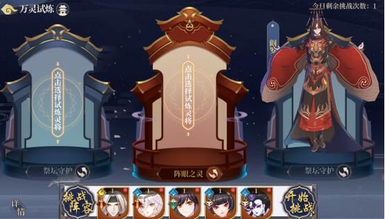 说明:玩家可以选择要试炼的三个灵将,设置后在副本中将产出这些灵将的残魂;每天可以挑战一次,次日刷新次数;试炼开始后不可以再更换试炼灵将和出战阵容;可以中途放弃试炼,放弃后不返还挑战次数