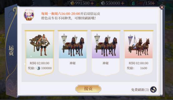 说明:自己可以接取贡车,然后通过运送贡车来获得奖励,接取贡车时可以刷新来获得更高品质的贡车,贡车品质越高,成功运送后的奖励越多。