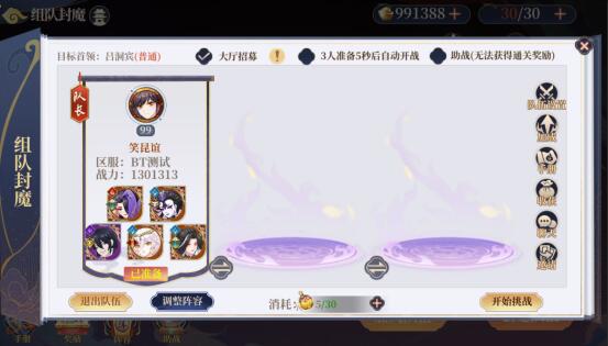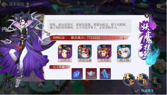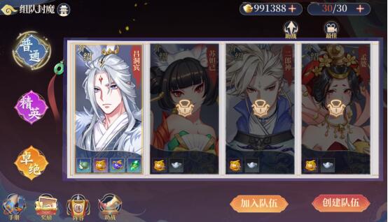 说明:玩法内共有吕洞宾、苏妲己、二郎神、孟婆四个头目,各自有普通、精英、卓绝三个难度,每个难度下的每个副本需要单人先通关一次,然后可以和其他玩家一起组队通关,支持最少两人最多三人同时参与