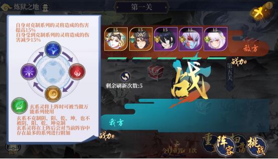 无论玩家是否能够通关,都可以使用重置功能来重置关卡,重置后关卡对手会重新生成,同时玩家的灵将也会恢复到初始状态,已阵亡的灵将也可继续战斗。
