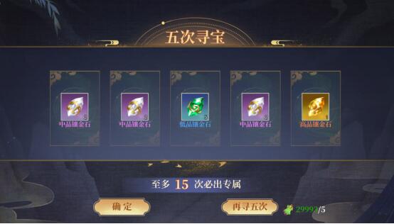 说明:玩家可以选择单次抽取或五次抽取,分别消耗一个和五个寻宝令道具,最多每20次抽取比出一次专属装备,其余奖励专属装备升级材料。每累计抽取10次可开启一次宝箱,获得珍贵道具奖励。