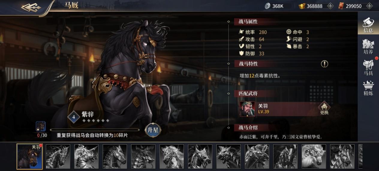 游戏里不止有武将升级提升战力这个办法,下面说一说除了武将外,也能快速提升玩家战力的办法,首先是在界面培养-战马,这是前期一个快速提升战力的办法,战马的战力加成对武将非常大,所以有条件的话建议玩家早点入手,战马可以通过完成马踏天下的任务和参加排行榜活动来获取战马