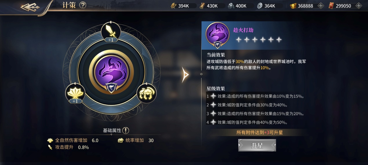 除了武将的提升和战马外,计策的升级对玩家战力的提升也是巨大的,不仅可以提升玩家的战力,在攻城防站中也有不俗的提升,升级所需:对应技能碎片,玩家可通过挑战丝绸之路后获取对应技能碎片