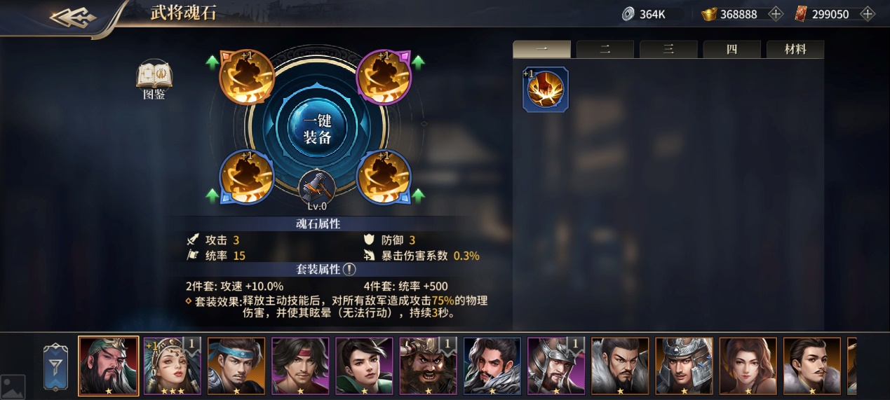 除了战马对武将的提升外,一套魂石的加成对武将的提升也是巨大的,不同的魂石套装效果是不同的,玩家可以根据需要自行需要切换所需要的套装的效果加成,魂石可以通过魂石祭祀获取及升级培养,建议手头宽裕的玩家可以优先获取,高战力玩家必备