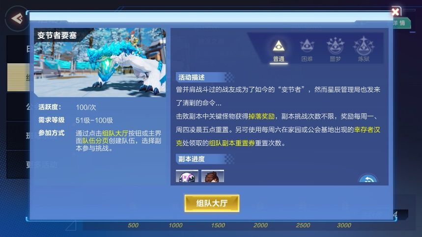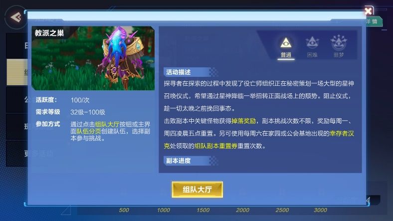 活动副本开放时间: 一周两次,周一周四重置,周六额外再送一张门票活动副本背景介绍:探寻者在探索的过程中发现了役亡师组织正在秘密策划一场大型的星神召唤仪式,希望通过星神降临一举扭转正面战场的颓势。活动副本参与方式:通过组队页面或者活动页面进入,拥有强大的团体可以使效率提高,难度太高,建议满配阵容进入。等级要求32-100级