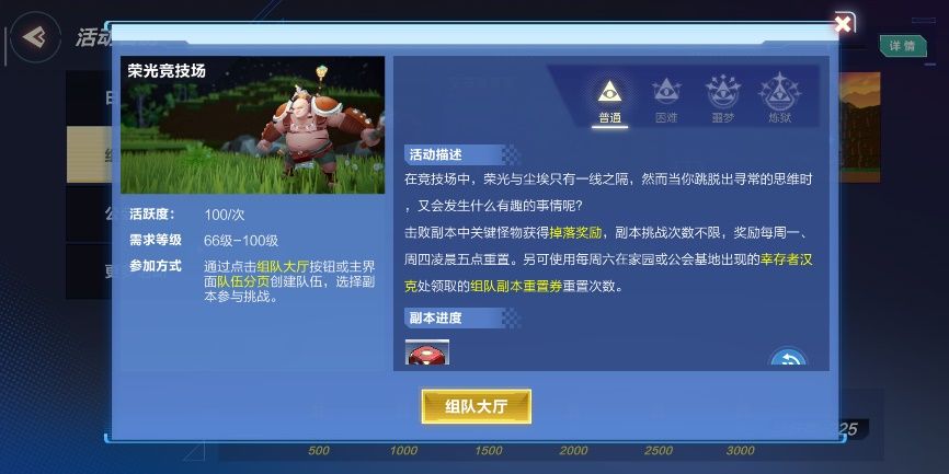 荣光竞技场活动副本开放时间:不限活动副本背景介绍:在竞技场中,荣光与尘埃只有一线之隔,然而当你跳脱出寻常的思维时,又会发生什么有趣的事情呢?活动副本参与方式:通过组队页面或者活动页面进入,拥有强大的团体可以使效率提高,难度太高,建议满配阵容进入。等级要求66-100级(需要保护副本中的金猪,你也可以把他搬到安全的地方)