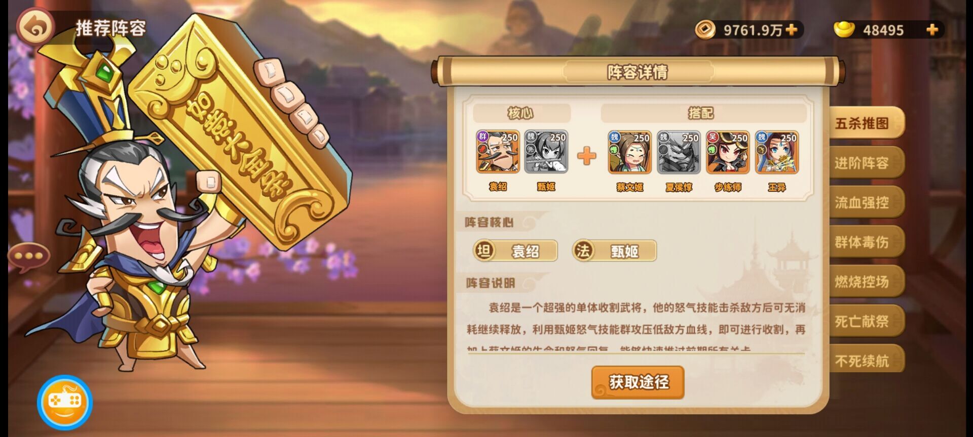 阵容特征:新手基础阵容,成型难度低适用性强阵容核心:袁绍+甄姬+蔡文姬+夏侯惇+步练师阵容说明:袁绍是一个超强的单体收割武将,他的怒气技能击杀敌方后可无消耗继续释放,利用甄姬怒气技能群攻压低敌方血线,即可进行收割,有更好的AOE武将也可以替换甄姬和王异,再加上蔡文姬的生命和怒气回复,能够快速推过前期所有关卡。
