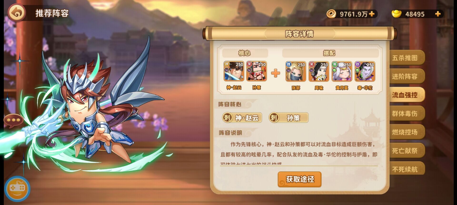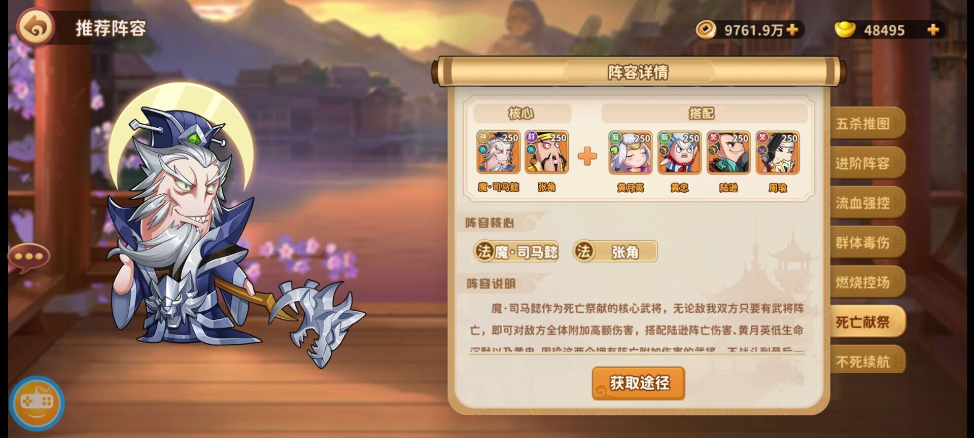阵容特征:射手阵容,持续伤害高,尤其是BOSS类副本,但是身板比较脆阵容组成:神左慈+黄忠+黄月英+陆逊+神郭嘉阵容说明:黄忠、神·郭嘉作为御射核心输出,两名武将均以群攻为主,并附带大量中毒·伤害,诸葛亮大招给队友带来高额伤害加成并且能驱散敌人增益,配合神·左慈的群体中毒·目标眩晕,敌人非死即残。