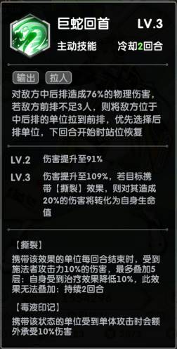 首先是碧荷的一技能:巨蛇回首。将敌方中后排英雄拉到前排,满级时若目标携带撕裂效果,则会将其造成的伤害20%转化为自身生命值。这是碧荷的核心技能,可以很好地为我们创造输出环境。