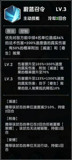 接着是夏娜一技能:蔚蓝召令,对敌方前中排4名单位减速,夏娜减速后就相当于我方加速了。