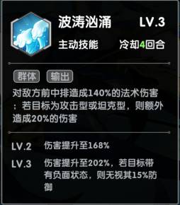 再接着就是月河一技能:波涛汹涌,打前中排,对攻击型和防御型英雄造成额外伤害,同时3级技能对负面状态的英雄,无视其百分之15的防御,我们前面已有减速,所以我们的伤害可以拉满。