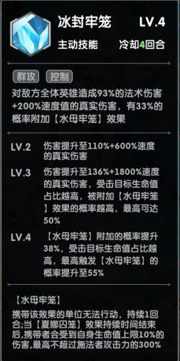 夏娜的二技能:冰封牢笼,实打实的控制,水母牢笼可以让对方单位无法行动一回合,可想而知,若是我们夏娜速度快,则对方的输出位在二回合打不出输出,可想而知该技能有多无敌。