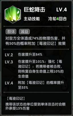 碧荷二技能:巨蛇降击。满级时对敌方造成伤害的同时,还有55%附加毒液印记,这个可以很好地搭配单体技能造成额外伤害,例如月河的二技能,若对方携带该效果死亡,则会恢复自身生命值10%血量,可以说也是个很好的技能。