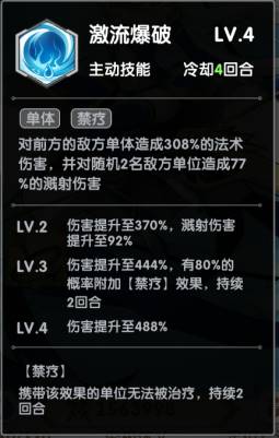 月河二技能:激流爆破。满级时对前方单体造成488%巨额法术伤害,同时还随机对2名敌方单位造成77%的溅射伤害,还有80%几率附加禁疗效果。可以说是输出很高的技能!