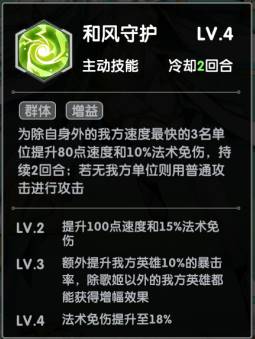歌姬二技能:和风守护。满级时为我方英雄提供10%暴击率以及100点速度。18%免伤,适合先出手的一技能,给我方加增益buff。