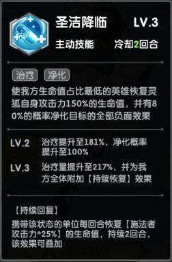 一技能:圣洁回血。给我方最低占比生命值的英雄净化负面效果并且回血,满级给我方全体附加持续恢复的效果。