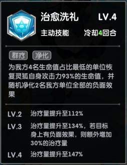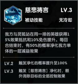 被动技能:慈悲祷言。对与灵狐同一排的英雄加效果抵抗和免伤效果,同时满级时每回合结束时还给我方英雄解控,净化一层减益效果,这不无敌?