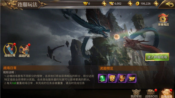 在主界面的右上方点击连服按钮就可以进入连服玩法,里面又分为战场日常和战场护送。其中战场日常里会有不同积分的怪物,击杀他们会获得相应的积分,而且战场里还有来自其他服务器的玩家,击败他们后会获得更高的积分。