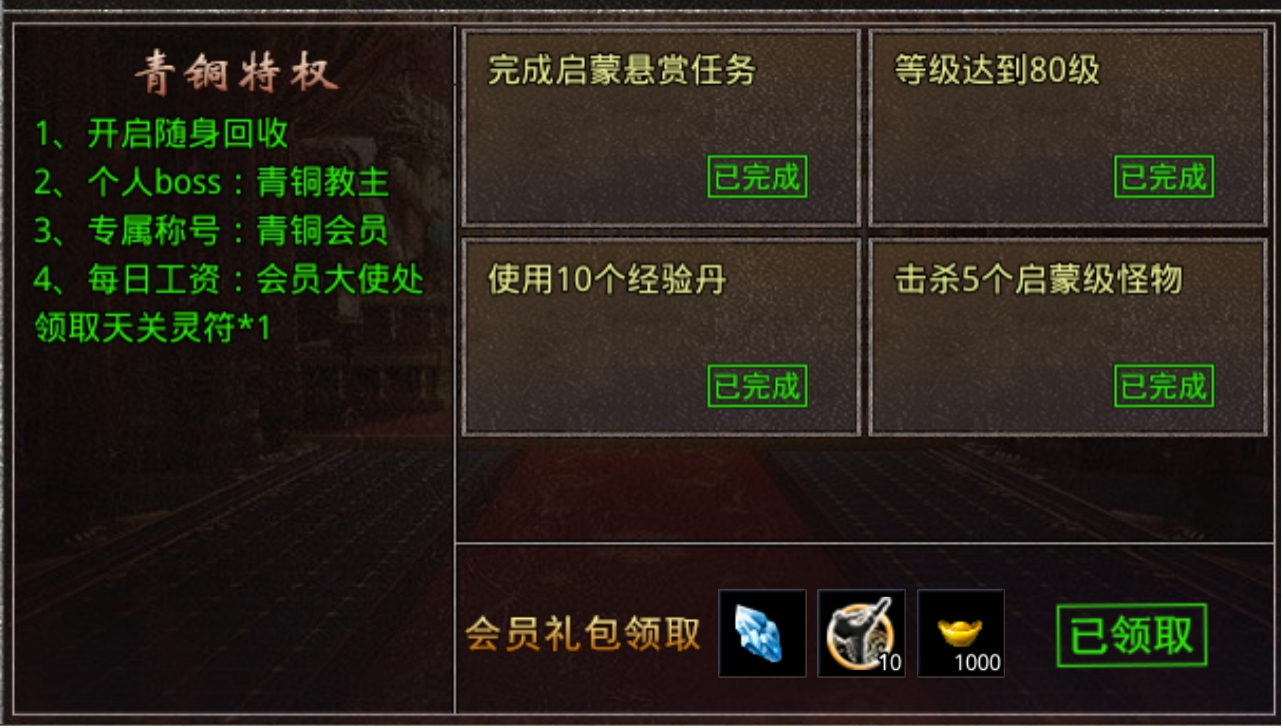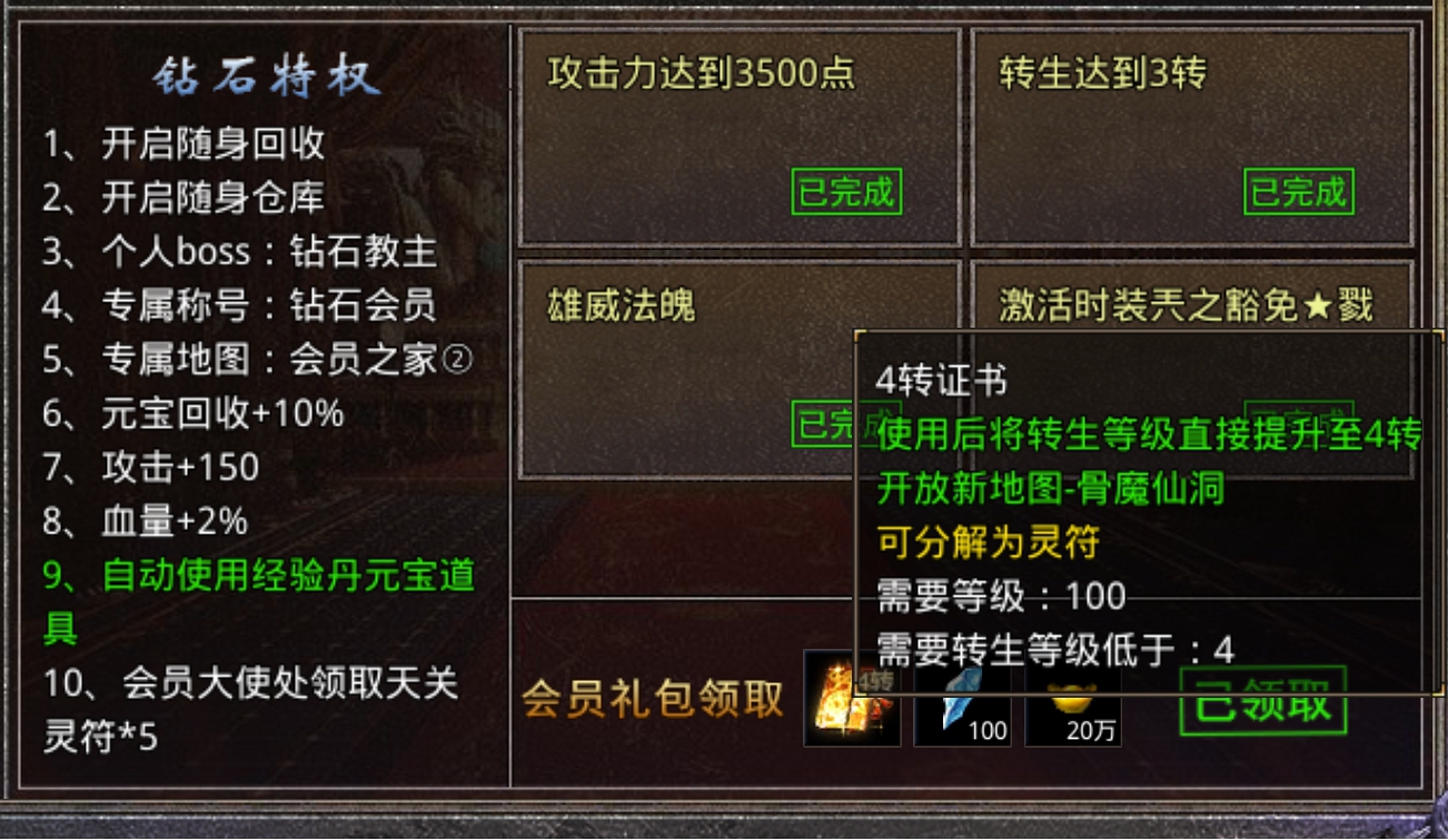 1、进入游戏完成新手任务,进入练功房拾取500万经验丹升至100级,并完成青铜会员任务。