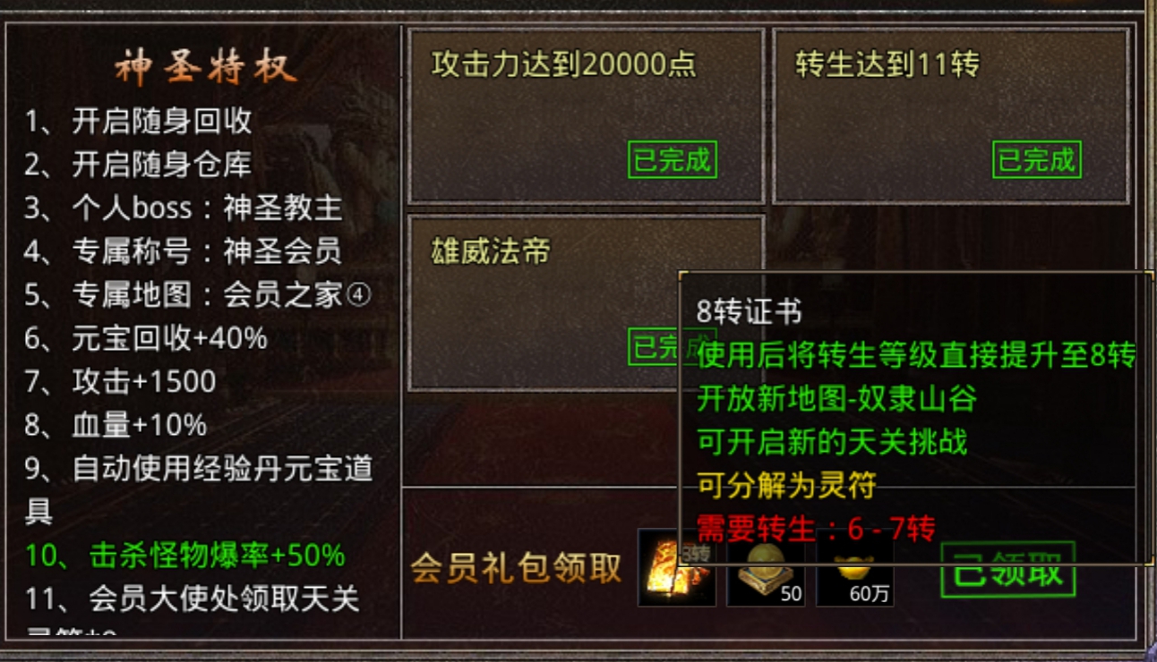 此捷径主要通过会员赠送转生的方法快速完成转生,节省大量时间精力。此时角色100级即完成8转,并解锁8转所有板块,领取8转所有奖励,同时获得青铜会员到神圣会员的所有奖励以及特权加持,大幅提升游戏体验,称霸区服指日可待。氪金玩家强烈推荐。