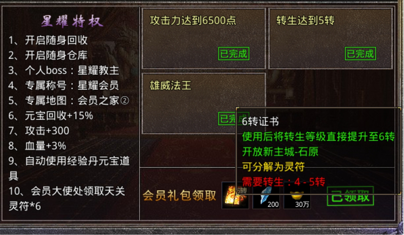 3、充值30000(300元)灵符购买星耀会员,领取6转证书解锁6转。