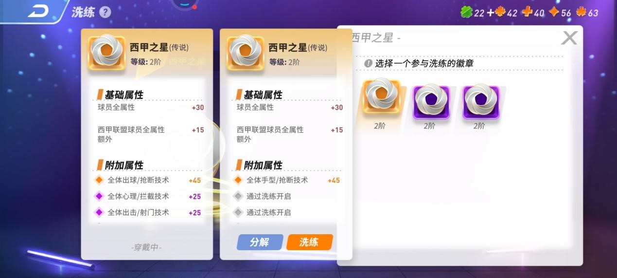 徽章除了基本的属性之外,还可以通过培养和洗炼来增强徽章的加成效果。选择一个参与洗炼的徽章,勾选要洗炼到当前佩戴徽章的属性,然后勾选要替换的属性,最后点击洗炼,完成属性的替换。徽章培养需要消耗四叶草,四叶草可以在联盟签到、联盟活动和联盟商店中获取。多余的徽章可以进行分解,分解徽章获得联盟星辉。