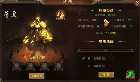 通过战魂洗练可以改变战魂资质,不断提升战魂基础属性,开启天赋槽位。使用资质丹来进行资质洗练,共有4个天赋槽位。