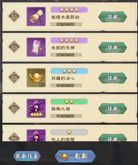 在征战三界中,遇到星级较低的任务时,可以使用元宝进行刷新。需要注意的是,如果有不想被刷新掉的任务,要先点击任务左侧的锁形图标进行锁定哦~