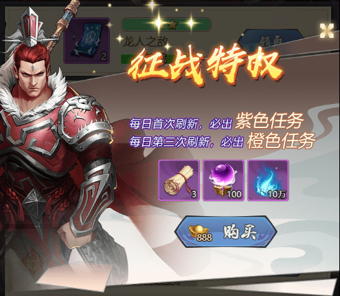 购买征战特权后,每日首次刷新必出紫色任务,每日第三次刷新必出橙色任务,并且用游戏内的元宝就可以购买,还附赠一些西行招募券和英雄培养材料,还是非常划算的。