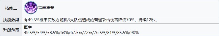 15级解锁的技能“雷电牢笼”有概率敌方普攻伤害降低70%,有效提高我方生存能力。