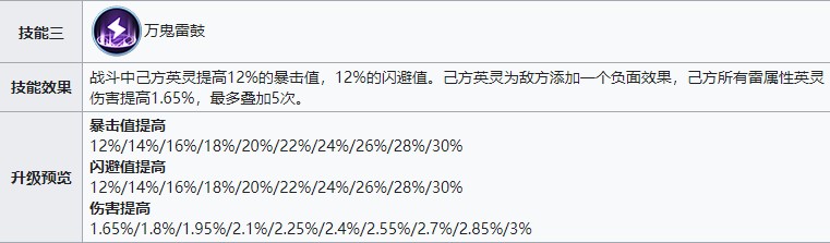 25级解锁的被动技能“万鬼雷鼓”在提供英灵暴击和闪避属性的基础上,额外对雷属性英灵提供增加伤害的被动属性。