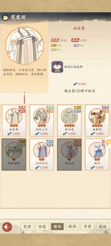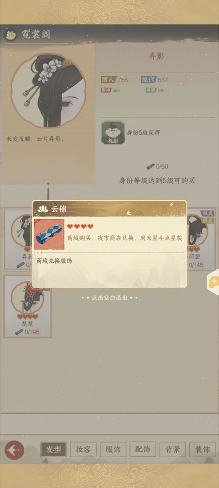 在霓裳阁中,可以使用“云锦”道具兑换各种限定服饰。
