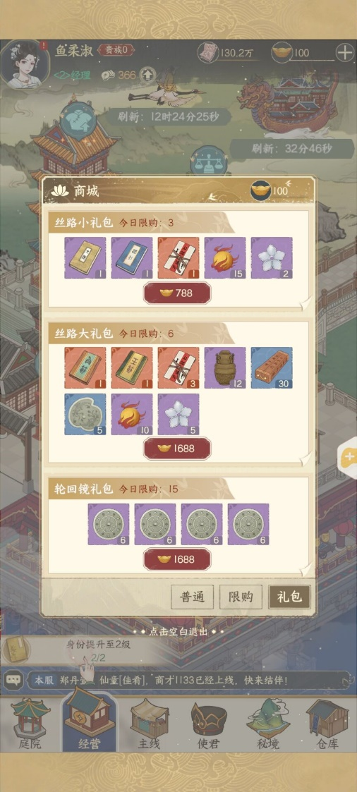元宝商铺分为“普通”“限购”“礼包”,使用元宝可购买相应的道具物品。