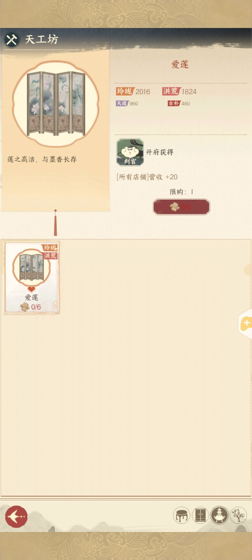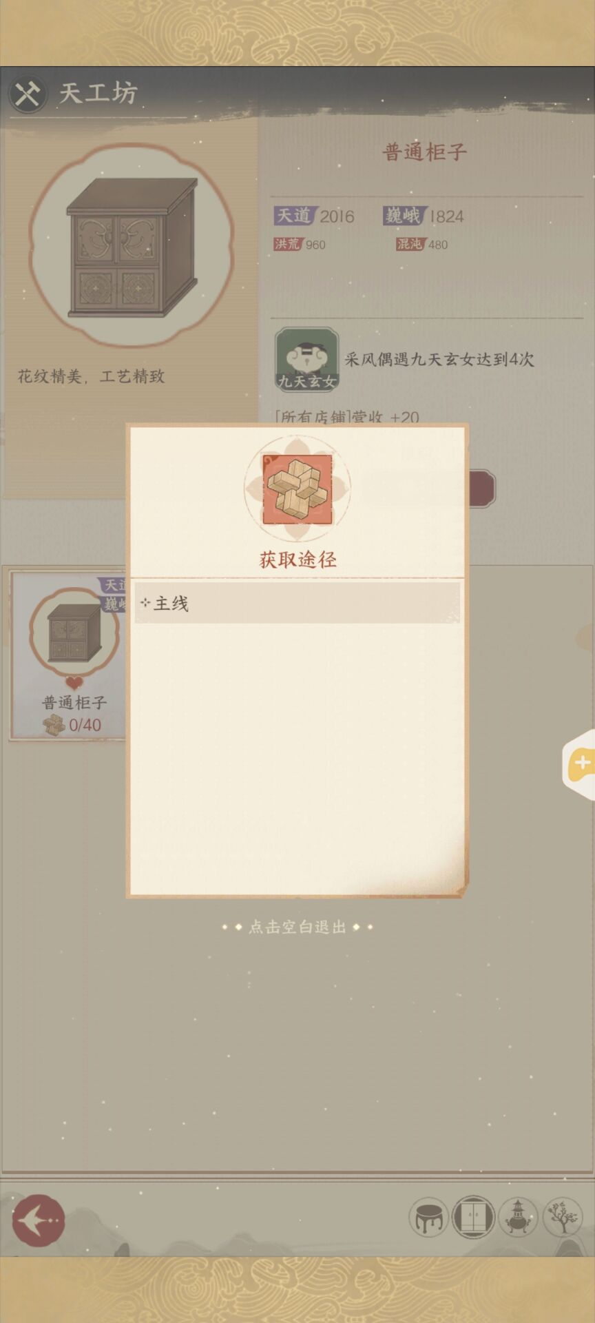 天工坊为兑换家具的系统,使用道具“鲁班木”可以兑换到相应的家具。