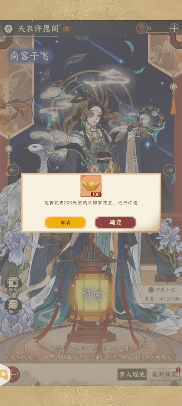 使用200元宝购买“锦罗花签”道具即可进行许愿;如果不想使用元宝许愿,也可等待右下角免费倒计时结束,可免费许愿一次。
