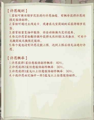 每次许愿都会获得额外的“天衣织锦”或“玉衣蚕丝”,可以用于兑换商城限量服饰。