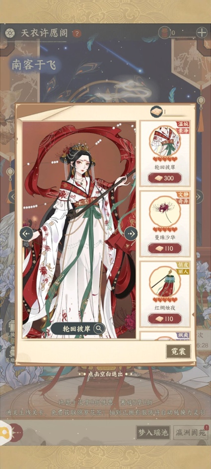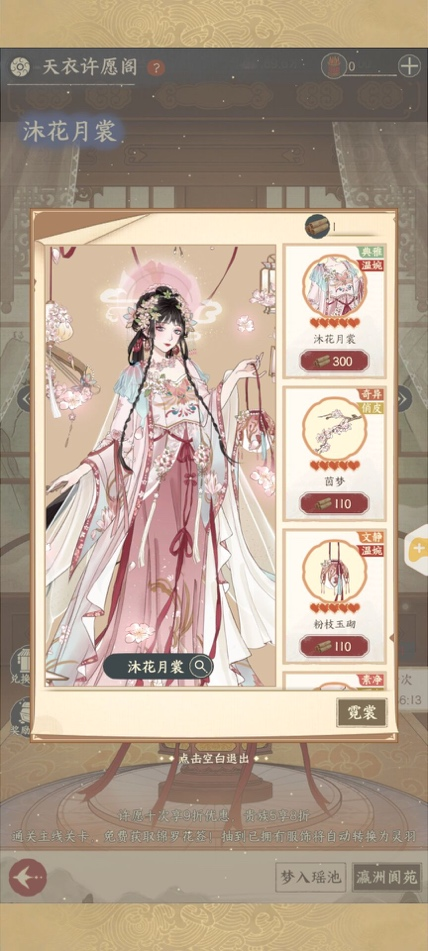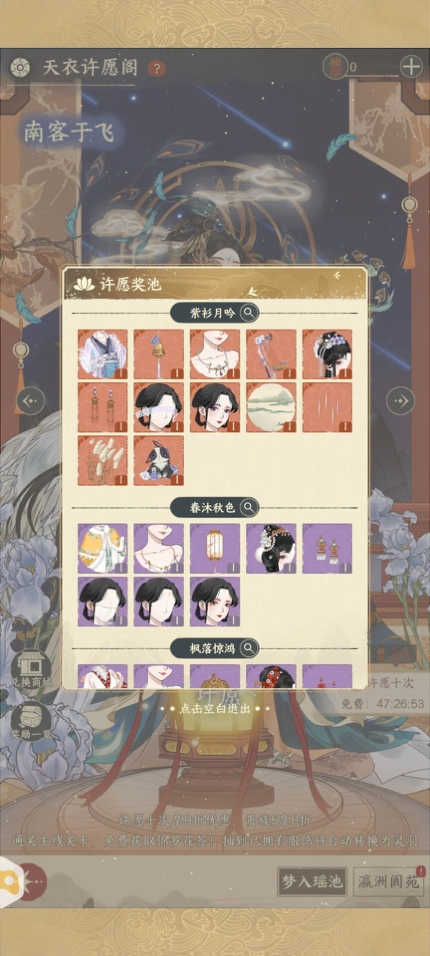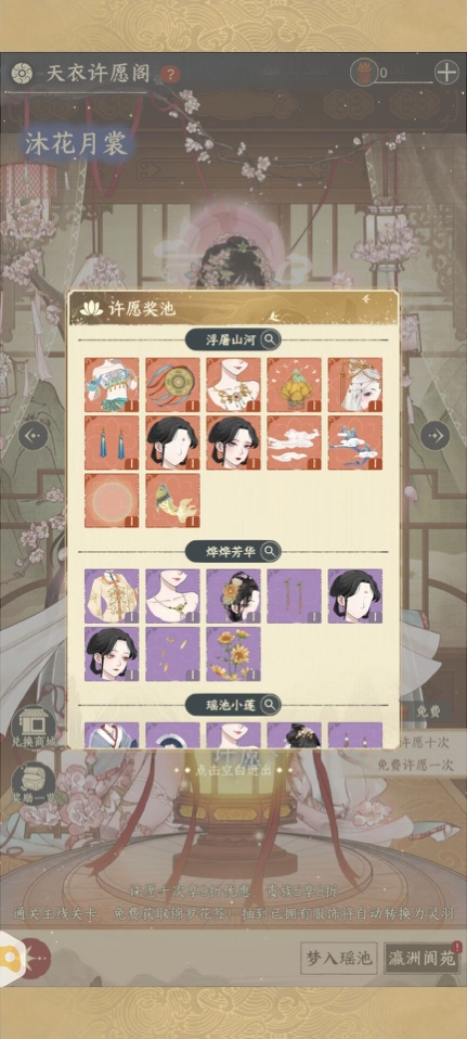 天衣许愿阁共分“梦入瑶池”“瀛洲阆苑”两个许愿池,每个许愿池都有独立的许愿奖励,可根据个人喜好选择对应的许愿池。