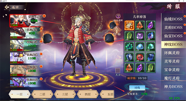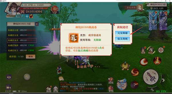 7.当疲劳值归0时玩家的攻击无法伤害boss,这时玩家可以通过仙玉商城或者元宝商铺购买神纹boss挑战卷来恢复疲劳值重新挑战boss