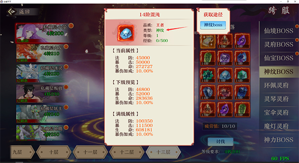 1.首先我们要熟悉神纹boss的界面,左方,是神纹boss的名字和等级,玩家需要选择能挑战通过的boss,等级是个很重要的信息