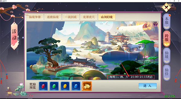 2.山河幻境只有在每周二四六的晚上9点到9点15分开启,玩家要·抓紧时间